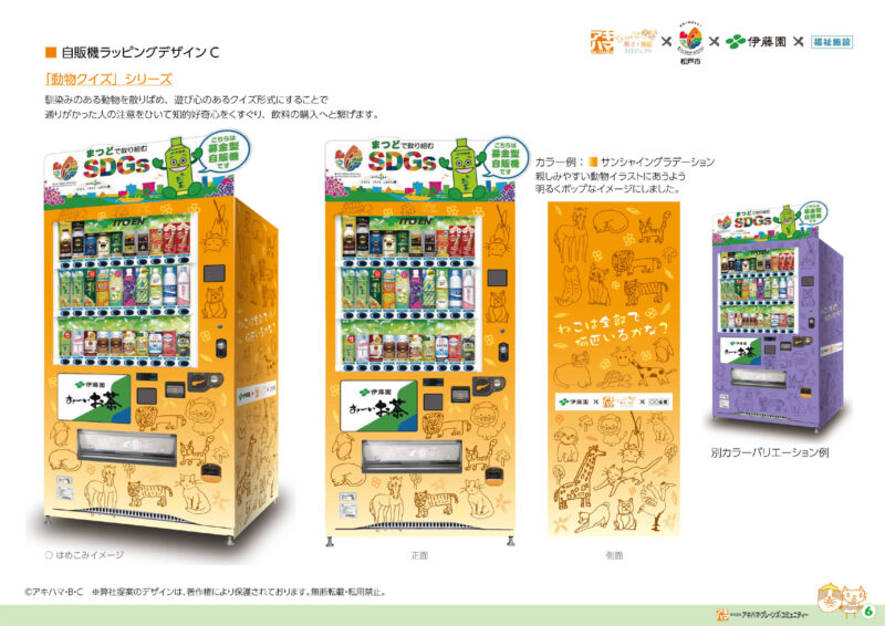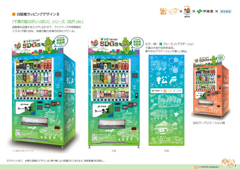異才多彩アートは「見て楽しい」だけじゃない 自販機の設置で広がる可能性と社会貢献への推進を。 異才多彩アート自体が独自の世界観を持ち、それだけでも魅力があります! さらに当プロジェクトはデザインプロモーションとして広がる可能性と、 CSR(企業の社会的責任)活動の一環として話題性を創出、SDGsや地域貢献に繋げます。 ※自動販売機設置先様が自動販売機年間収入の一部を松戸市のSDGs事業に寄付します。(伊藤園様による代理寄付) また松戸市内に当該自動販売機を設置いただいた際は、松戸市ホームページにて 設置場所のPRやご寄付に対するお礼状のお渡し等を実施いたします。 キラッキラ異才!発信プロジェクトは、株式会社伊藤園様の自動販売機に 異才アートをラッピングすることで、見た目を華やかに彩り、福祉施設の方の社会参画につなげていきます。![]()