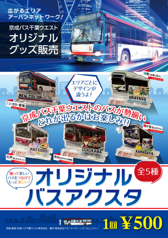 そして、オリジナルのアクリルスタンドのガチャもあります! 京成バス千葉ウエストの色々なバスごとにデザインが違い、連結もできます。 こちらは1回500円で不定期販売となりますので、見かけた際はチャンスです!